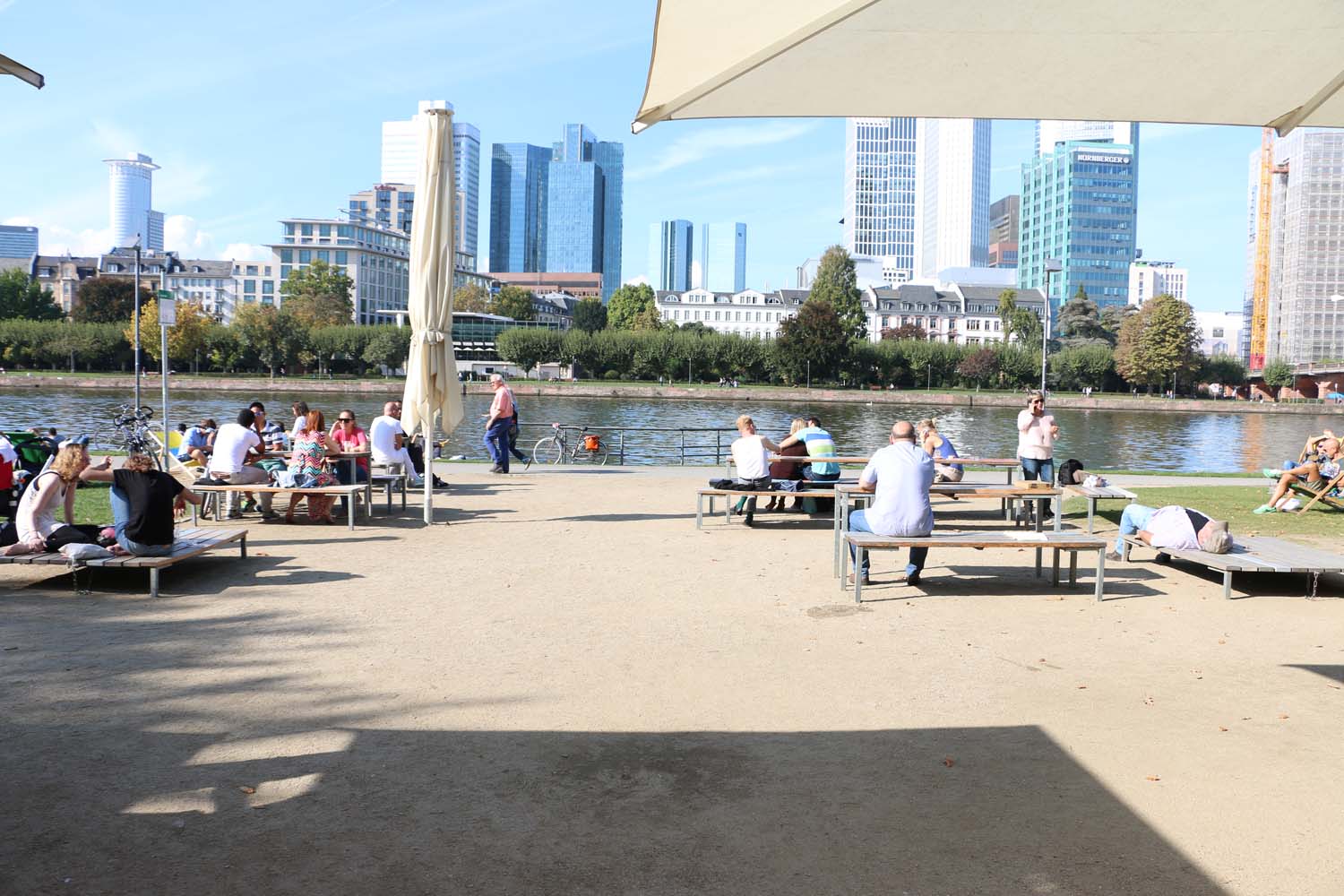 As you cross the bridge, you will reach the other side of the river “Mainufer” with lots of greens and nature. If the weather is nice then you are lucky, shops will be opened, and outside seating will be available. You can have a cold drink by the river, on a table or just on the grass.